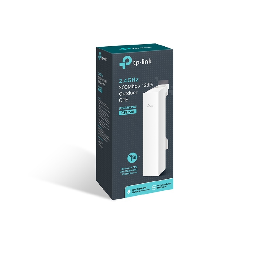 CPE de Exterior 2.4Gz 300Mbps 12dBiCPE220* Antena incorporada de 12dBi 2×2 MIMO direccional de doble polarizado* Potencia de transmisión ajustable de 0 a 30dBm/1000mw* Optimizaciones a nivel de sistema para transmisión inalámbrica de más de 13 kilómetros de largo alcance* La Tecnología TP-LINK Pharos MAXtream TDMA (Time-Division-Multiple-Access) mejora el rendimiento del producto, la capacidad y rendimiento de latencia, ideal para aplicaciones PTMP* Sistema de Administración Centralizada – Control Pharos* Modos de operación AP / Cliente / Repetidor / AP Router / AP Cliente Router (WISP)* Adaptador POE pasivo soporta hasta 60 metros (200 pies). Alimentación a través de puerto de Ethernet que permite que el dispositivo se restablezca de forma remotaCP220E exterior TP-LINK 2.4GHz 300Mbps 12dBi, especial para soluciones rentables para aplicaciones al aire libre de redes inalámbricas. Con su aplicación de gestión centralizada, es ideal para conexiones punto a punto, punto a multipunto y aplicaciones exteriores de cobertura Wi-Fi. Rendimiento profesional, con un diseño fácil de usar, hace del CPE220 una opción ideal para usuarios domésticos y empresariales.Con Qualcomm Atheros chipsets de nivel empresarial, antenas de alta ganancia, un material de gran calidad, caja especialmente diseñada, y la fuente de alimentación POE, CPE220 está especialmente diseñado para uso en exteriores y puede operar sin problemas en casi cualquier clima, con temperaturas de funcionamiento desde -30 ¿ (- 22 ¿) a 70 ¿ (158 ¿).Transmisión Inalámbrica de más de 13 km de alcanceUn diseño que rompe las barreras del rango tradicional de transmisión Wi-Fi, por lo que CPE220 es un producto ideal para aplicaciones al aire libre para redes inalámbricas.Tecnología TDMA TP-LINK MAXtreamA medida que aumenta la escala de red, la competencia y las colisiones wireless entre los CPEs y las estaciones base será tan enorme que el rendimiento real de la red caerá, dando como resultado un grave impacto en la experiencia del usuario final. Para mitigar estos efectos, la CPE510 utiliza tecnología TDMA MAXtream.Control Pharos ¿ Sistema de Gestión CentralizadaCPE220 también viene equipado con un software de gestión centralizada que ayuda a los usuarios a gestionar fácilmente todos los dispositivos de su red desde un solo ordenador ¿ Pharos Control. Las funciones como la detección de dispositivos, la monitorización del estado, la actualización de firmware, y el mantenimiento de la red se pueden manejar usando Pharos Control.