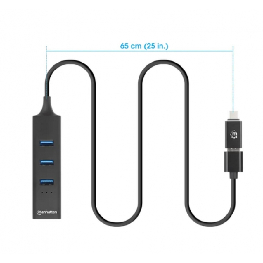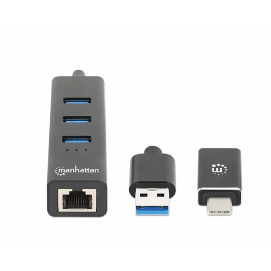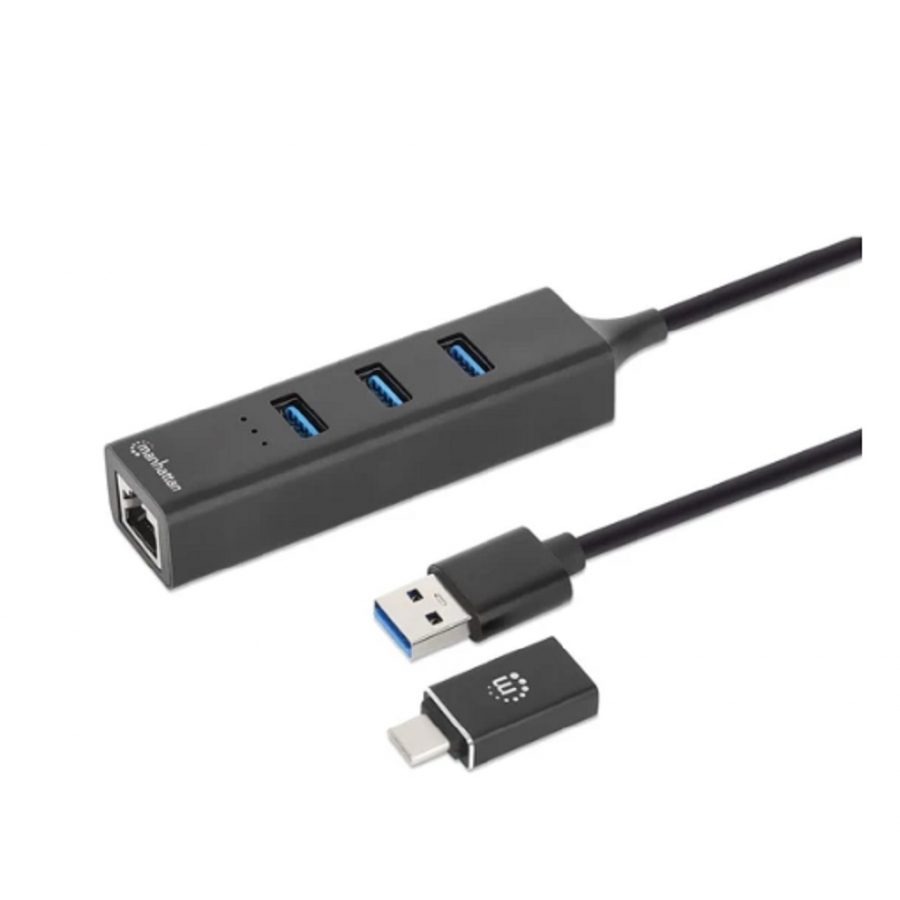 Hub USB-c / USB-a de 3 puertos con adaptador de red lan gigabit ethernet para disponer de más formas de conectar tu computadora portátil.utilizando uno de los puertos USB de tu dispositivo, el hub USB 3.0, con combinación de conectores USB tipo-c y tipo-a, de 3 puertos y adaptador de red gigabit ethernet de manhattan añade conectividad a internet por cable a tu computadora portátil en lugares donde el wi-fi no es confiable o no está disponible. También te ofrece tres puertos USB-a para conectar fácilmente un teclado, un mouse, una unidad de memoria flash y mucho más. Los dispositivos que se ajustan a la especificación USB 3.2 pueden alcanzar velocidades de transferencia de hasta 5 gbps para almacenamiento externo, impresión y mucho más. Los puertos superspeed del concentrador son compatibles con versiones anteriores de USB 2.0 o incluso 1.1. También puedes cargar tu teléfono o tableta, ya que el hub suministra hasta 5 v / 0.9 a de potencia.conexiones USB-a y USB-c versátiles para muchos sistemas operativosgracias a la conexión USB-a integrada y el adaptador USB-c incluido que encaja sobre ella, puedes conectar este concentrador a una variedad máxima de dispositivos USB host. Elije el conector que funcione con tu pc, laptop, tableta, macbook®, chromebook y surface®, y conéctalo directamente.conectividad que puedes llevar a todos ladosla carcasa resistente, el tamaño compacto y la alimentación por bus de este hub USB se traducen en una mayor portabilidad para cuando tengas que hacer las maletas y viajar. No tienes que preocuparte por llevar una fuente de alimentación adicional, lo que convierte al hub en el compañero de viaje ideal. Basta con desenchufarlo del dispositivo de subida, desconectar los periféricos y guardar lo que necesites en tu mochila.universalmente compatible para una instalación sencillaeste concentrador USB 3.0 universal funciona con una amplia gama de computadoras, porque no requiere software ni controladores adicionales. Se instala automáticamente al conectarlo a tu laptop o pc, por lo que puede ponerse en marcha rápidamente. También funciona con una gama de sistemas operativos como windows®, macos®, linux y chrome os, por lo que es compatible con múltiples plataformas.ideal para añadir conectividad de red por cable a una consola de juegos switchcomo switch no tiene un puerto rj45 integrado, sólo puedes usar sus funciones en línea de forma inalámbrica, lo que puede significar velocidades de transferencia más lentas, ping más alto y menos estabilidad de conexión. Este adaptador te ofrece una actualización con cable para obtener la mejor conectividad de red.mejora la conectividad de tu dispositivo convirtiendo un puerto USB en un puerto de red gigabit y tres puertos USB de 5 gbpsun puerto gigabit ethernet (10/100/1000) para acelerar las descargas, la transmisión multimedia y los juegostres puertos USB-a para conectar mouse, teclados, unidades de memoria flash y más, o para cargar y sincronizar dispositivos móvilesdos USB 3.2 gen 1 (anteriormente USB 3.0) con puertos tipo a, con velocidad de transferencia superspeed de 5 gbps y cargas de hasta 4.5 w (5 v/0.9 a)cable USB-a integrado; incluye un conector adaptador USB-c independiente para mejorar la conectividad con más dispositivos.ideal para pcs de escritorio, y dispositivos portátiles como ultrabooks, laptops, chromebooks, macbooks®, surface® y máscompatible con windows®, macos®, linux® y chrome osideal para añadir conectividad de red por cable a una consola de juegos switchcompatible con versiones anteriores de USB 2.0 y ethernet 10/100alimentado por bus – no se requiere alimentación externaleds indicadores para un fácil monitoreosoporta intercambio durante su usocable integrado de 65 cm (25 pulg.)carcasa de aluminio resistente y elegante, ideal tanto para la oficina como para viajesdiseño portátil, compacto y ligero que cabe fácilmente en bolsas y mochilas