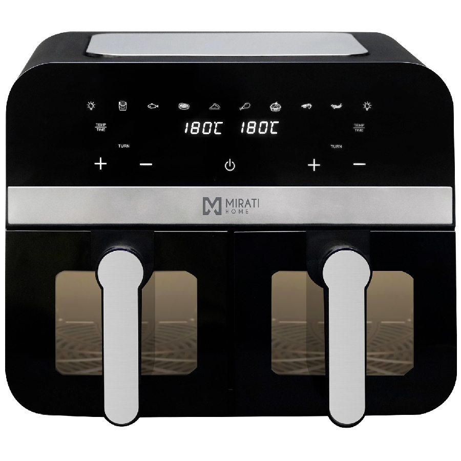 Freidora de aire con panel digital marca mirati home con 2 ventanas para visualizar los alimentoscapacidad de 9 litros (dos canastas de 4.5l cada una)potencia: 1700wtemporizador de hasta 60 mintemperatura desde 80° hasta 200° para preparar diferentes platillosmodos predeterminados: papas a la francesa, pescado,carne, pizza, pollo, reposteria, mariscos, tocinoelaborado con acero inoxidable (sus304) y revestimiento aprobado por la lfgb para el cuidado de tu salud