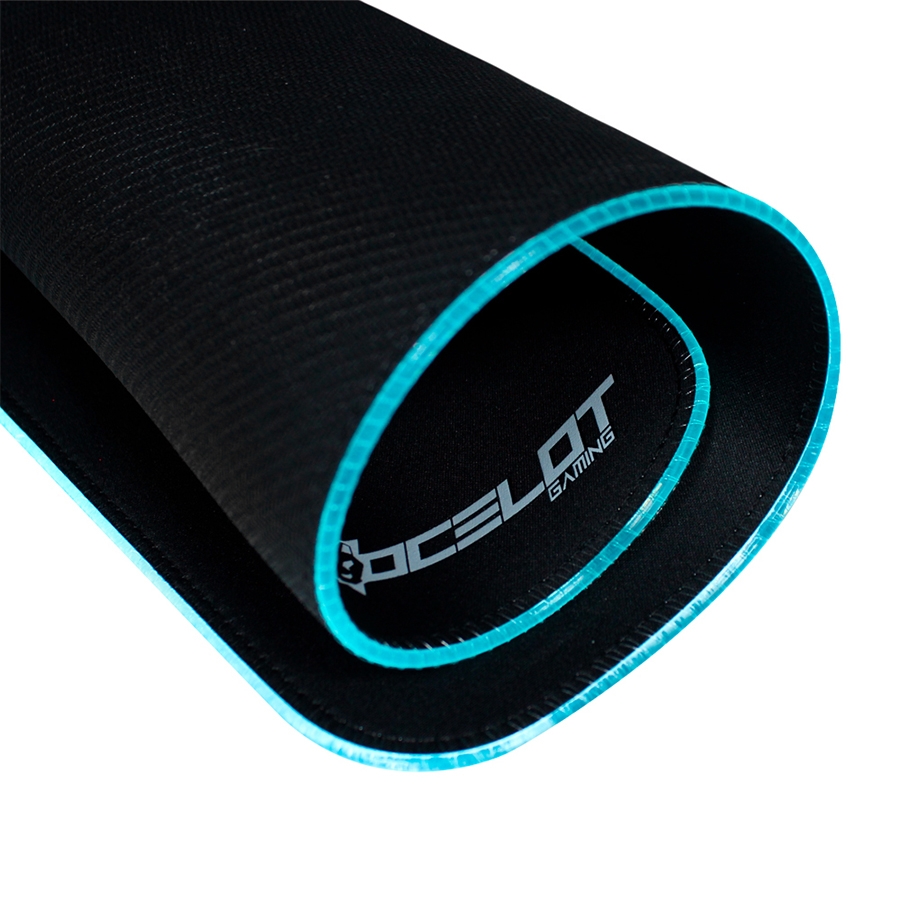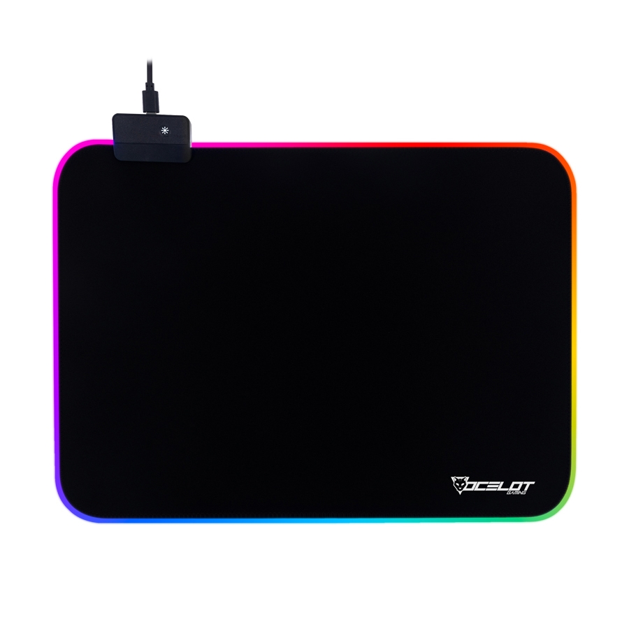 Ocelot mouse pad de tela rgb con software de control de iluminación integrado medida: 350*250*3mmmaterial anti derrapante de goma alimentación de energía mediante conector USB, largo del cable 1.8m recubierto en naylon 14 modos de color + 7 colores