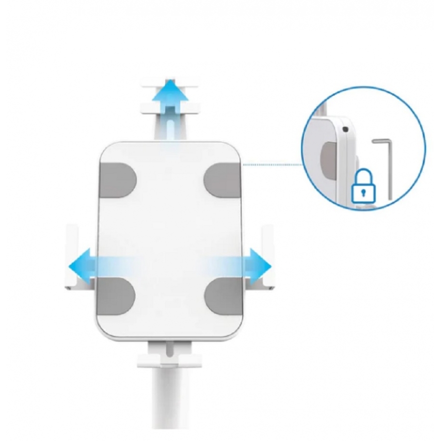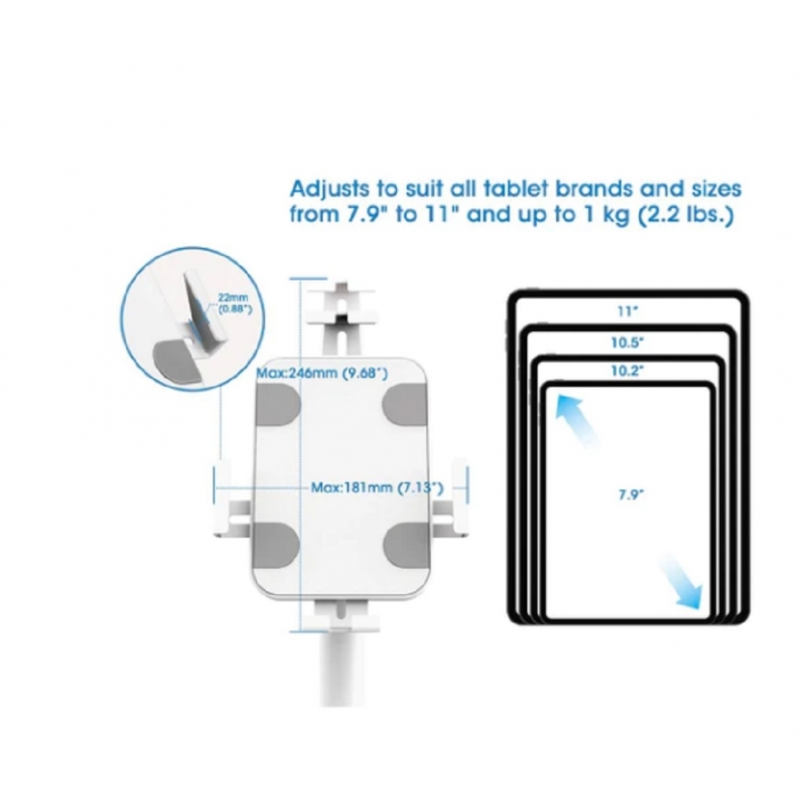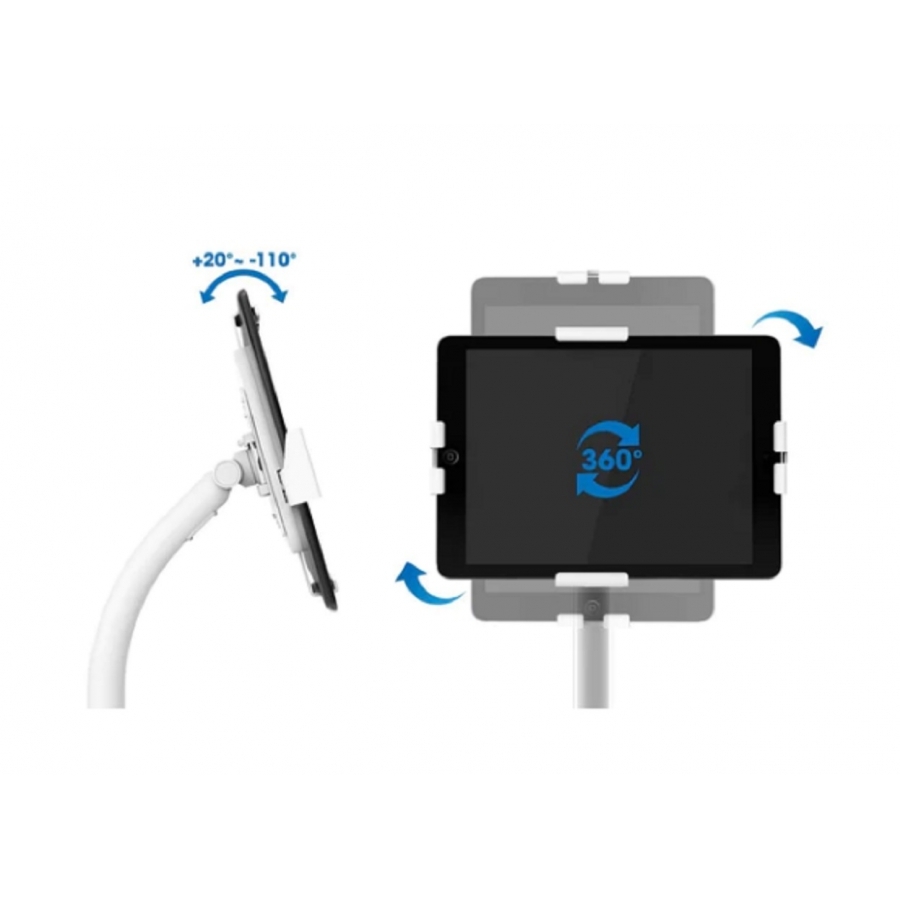 Gestión de cables limpia y ordenadala gestión de cables dentro del poste mantiene los cables ocultos y organizados para dar un aspecto profesional a la instalación.soporte de kiosco seguro y antirrobo que se ajusta para adaptarse a todas las marcas y tamaños de tabletas de 7,9 a 11 y hasta 1 kg (2,2 lbs.)base independiente que puede atornillarse al suelo con los herrajes incluidosaltura ajustable de 790 a 1190 mm (31,1 a 46,9 pulg.)rotación completa de 360° para orientación de pantalla horizontal o verticalvistas optimizadas con inclinación de +20° a -110abrazaderas bloqueables mediante llave incluida para fijar el dispositivo al soportegestión de cables interna para mantener los cables ocultos dentro del posteelegante y limpio acabado blanco que complementa los dispositivos y la decoraciónconstrucción robusta de acero con recubrimiento de polvo antiestáticodiseño abierto para acceso completo a todos los puertos, botones, cámara frontal y traseraparte posterior suave y almohadillas de espuma en las abrazaderas del soporte para evitar arañazos en el dispositivocarril deslizante en la parte posterior del soporte para ajustar el dispositivo a la posición idealcompatible con la mayoría de tabletas de 7,9 a 11, como ipad®, ipad air®, ipad mini®, samsung® galaxy tab, microsoft® surface® pro y surface go.ideal como terminal de punto de venta en comercios, para el registro de huéspedes en hoteles, para sujetar señalización digital en stands de ferias y mucho mástres años de garantía