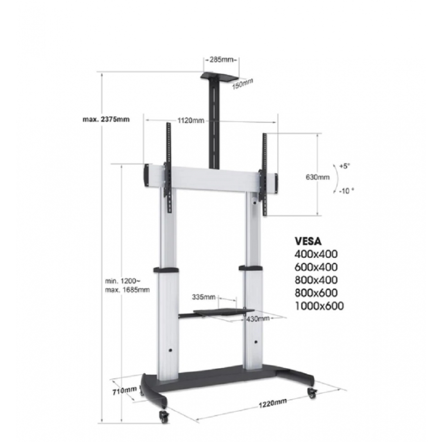 FEATURES:CARRITO MULTIFUNCIONAL PARA UNA PANTALLA DE 60 A 100 DE HASTA 100 KG (220 LBS.)VISTAS OPTIMIZADAS CON UNA INCLINACIóN DE -10 A 5°ALTURA AJUSTABLE DE 1200 A 1685 MM (47,2 A 66,3 PULG.)ESTANTE DE COMPONENTES DE AUDIO/VIDEO CON UN ESPACIO DE 335 X 430 MM (13,2 X17 PULGADAS) Y UNA CARGA NOMINAL DE 5 KG (11 LBS.)REPISA PARA COMPONENTES DE AUDIO/VIDEOREPISA DE CáMARA DE MONTAJE SUPERIOR CON UN ESPACIO DE 150 X 285 MM (5,9 X11,2 PULG.) Y UNA CARGA NOMINAL DE 5 KG (11 LBS.), IDEAL PARA VIDEOCONFERENCIASCHAROLA PARA CáMARA EN LA PARTE SUPERIOR, IDEAL PARA VIDEOCONFERENCIASCONSTRUCCIóN DE ALUMINIO DE PRIMERA CALIDADADMINISTRADOR INTERNO DE CABLE PARA UNA APARIENCIA LIBRE DE ENREDOSRUEDAS DE USO RUDO CON UN DISEñO REFORZADO PARA SOPORTAR EL PESO DEL EQUIPO YPERMITIR UN MANEJO MáS SENCILLOCUMPLE CON LAS NORMAS DE LA VESA: 400X400, 600X400, 800X400, 800X600,1000X600GARANTíA DE POR VIDA. CONSULTE EL TIEMPO DE GARANTíA EN SU PAíS.ESPECIFICACIONES:GENERAL DISEñADO PARA LA MAYORíA DE LAS PANTALLAS DE 60 – 100. CAPACIDAD DE PESO: 100 KG (220 LBS.) INCLINACIóN: -10 A 5°. CHAROLA PARA LA CáMARA- DIMENSIONES: 150 X 285 MM (5.9 X 11.2 IN.)- PESO QUE SOPORTA: 5 KG (11 LBS.) CHAROLA PARA DISPOSITIVOS DE A/V- DIMENSIONES: 335 X 430 MM (13.2 X 17 IN.)- PESO QUE SOPORTA: 5 KG (11 LBS.) DIMENSIONES DE LA BASE: 710 X 1220 MM (28 X 48 IN.) VESA: 400X400, 600X400, 800X400, 800X600, 1000X600