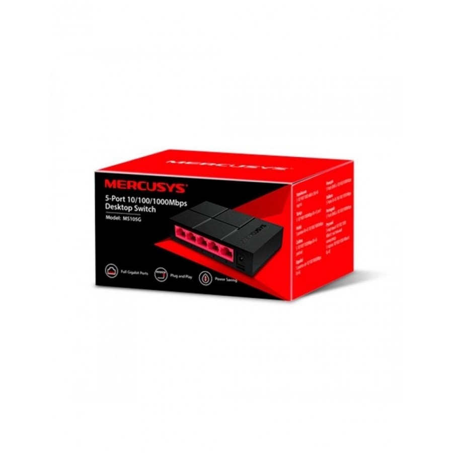 Switch de escritorio de 5 puertos 10/100 / 1,000 MbpsMS105G* Cinco puertos RJ45 de autonegociación de 10/100 / 1,000 Mbps con MDI / MDIX automático admitidos* Expansión de red fácilmente cableada* Diseño compacto para disposición flexible* Configuración plug and play, no requiere configuración* La tecnología Green Ethernet ahorra energía hasta en un 82%Expandir la red Ethernet con puertos GigabitAmplíe rápidamente su red cableada con cinco puertos Ethernet de 10/100/1000 Mbps, 10 veces más rápido que los puertos Ethernet normales de 10/100 Mbps. MS105G es flexible y totalmente compatible con televisores 4K Ultra HD, computadoras, impresoras, cámaras IP, consolas de juegos y más. Esto lo hace perfecto para usar en entornos domésticos, de oficinas pequeñas e incluso de dormitorios.Diseño fresco y ultra compactoUna construcción elegante y cuadrada con una combinación fresca de color rojo y negro brinda una apariencia y sensación de alta tecnología. Con el mismo tamaño que un teléfono inteligente, MS105G se encuentra en cualquier lugar de su hogar sin tomar demasiado.Conecta y reproduceOlvídate de la instalación complicada. Simplemente conecte el interruptor a su TV o computadora a través de un cable Ethernet para expandir inmediatamente su red cableada. Absolutamente ninguna configuración es necesaria.Desempeño confiableCon la tecnología Half-Full Duplex y MAC Address Learning, MS105G proporciona hasta 10 Gbps de ancho de banda de conmutación estable. Cada unidad se somete a pruebas exhaustivas antes del envío para garantizar que proporcionará conexiones confiables e ininterrumpidas durante los próximos años.Ahora tiene la opción de cambiar a verde cuando se actualiza a una red de gigabits! MS105G cuenta con las últimas tecnologías innovadoras de eficiencia energética para ampliar enormemente la capacidad de su red con mucha menos energía. Ajusta automáticamente el consumo de energía según el estado del enlace y la longitud del cable para limitar la huella de carbono de su red.