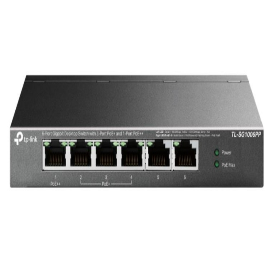Tl-sg1006pp switch gigabit de sobremesa de 6 puertos con POE+ de 3 puertos y POE++ de 1 puerto6× puertos rj45 de 10/100/1000 mbpscon un puerto POE++ y tres puertos POE+, transfiere datos y energía en un único cablefunciona con dispositivos pd compatibles con ieee 802.3af/at/bt802.1p/dscp qos permite un tráfico fluido y sensible a la latenciasoporta potencia POE de hasta 30 w para cada puerto POE+ y 60w para el puerto POE++soporta potencia POE de hasta 64 w para todos los puertos POE*hasta 250m de alcance de transmisión de datos y energía en modo de extensión**la recuperación automática POE garantiza el funcionamiento estable de los dispositivos POE al reiniciar automáticamente los dispositivos pd desconectados o no responsivosconectar y usar, sin necesidad de configuración ni instalación